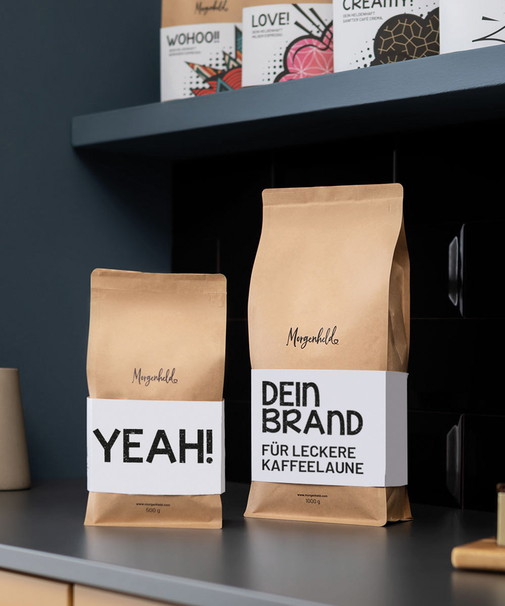 Scheinbar hast du langweilige Kundengeschenke so satt wie wir. Wir personalisierbaren Deinen Morgenheld-Kaffee als Werbegeschenk oder Firmenpräsent. Einfach Logo, Name oder Slogan drauf und schon machst du dich jeden Morgen unvergesslich! Deine Kunden werden es lieben. Yeah!
